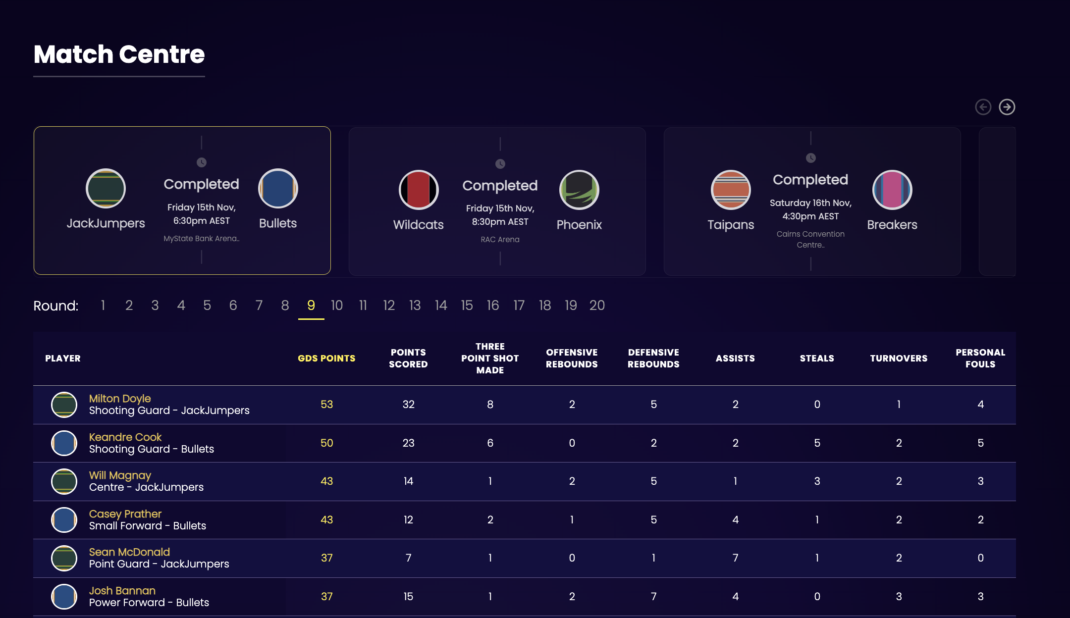 It is important to note: Basketball, live data will not go through the Match Centre in real time. This data will instead be updated at the conclusion of each match. It is our hope we are able to transition this to quarterly updates during the current season with live scoring for this sport coming next season.